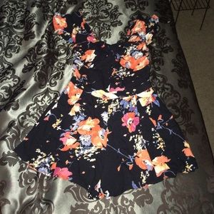 It's a navy romper with orange, sky blue, and beige flowers. Great material for the summertime.