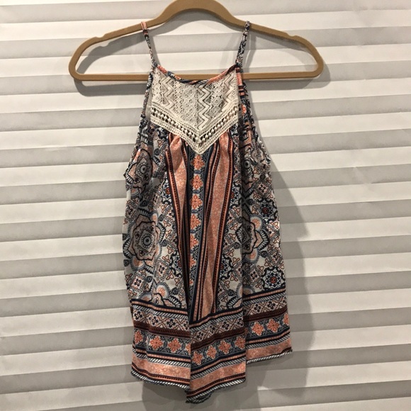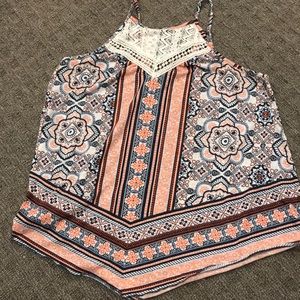 Funky summer top with fun lace appliqué on front. Keyhole back.