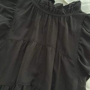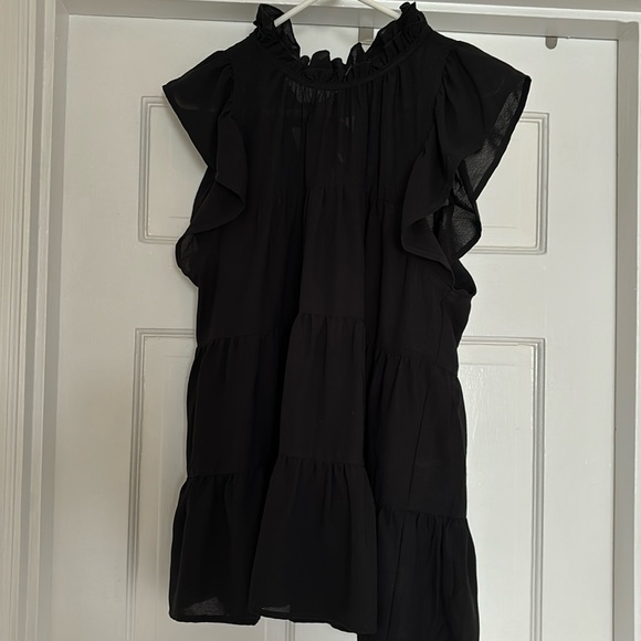 Black top with a mock neck, flutter sleeves, ties behind neck. Purchased at a boutique.