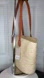 This stylish cream tote bag features durable tan straps, perfect for everyday use. Its elegant design makes it a versatile accessory for any outfit. Perfect for summer.