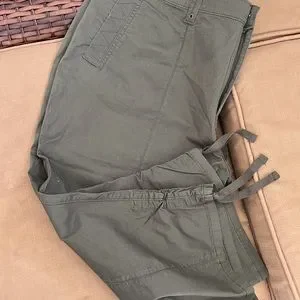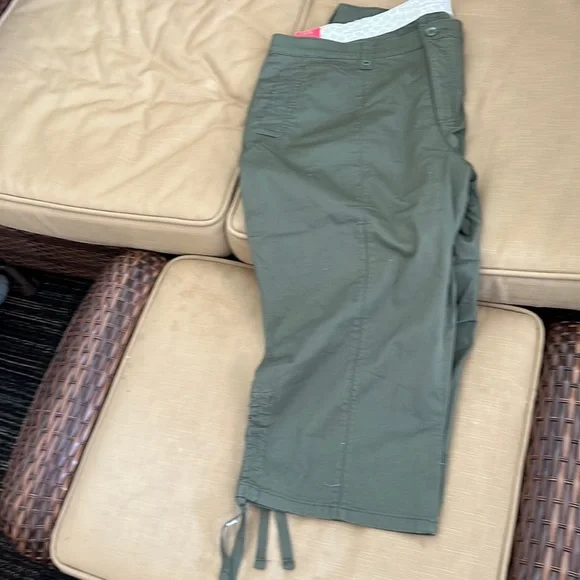 Light weight capris/drawstring rushing on legs. These are 4 pocket with belt loops trimmed with matching grommets. Full functioning zipper.