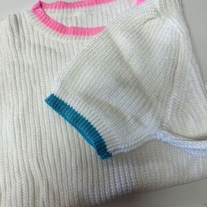 New with tags in original Packaging. Summer knit rainbow trim sweater. Light weight white knit with pink yellow orange and turquoise trim. Boutique brand is t rue to size. We love this look with a crisp white jean or shorts for a fun vacation vibe.