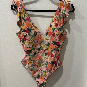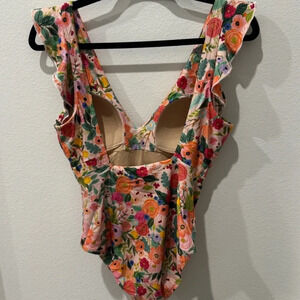 Dive into style with this Summersalt one-piece swimsuit, featuring a striking red and pink color palette. The ruffle back detail adds a playful touch, making it perfect for a day at the beach or pool. Enjoy a blend of comfort and elegance with this standout swimwear piece. Great preloved condition