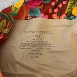 Experience elegance with this Summersalt one-piece swimsuit, showcasing a bold red and pink color scheme. The design features a plunging V-neckline and charming ruffled shoulder straps, ideal for a stylish day at the beach or pool. Long torso excellent used condition