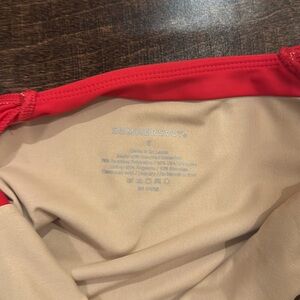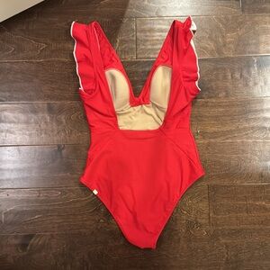 This vibrant red one-piece swimsuit by Summersalt features ruffled details (white underneath) along the deep V-neckline and shoulders. The classic cut, padding and standard leg line ensure a flattering silhouette. TTS.