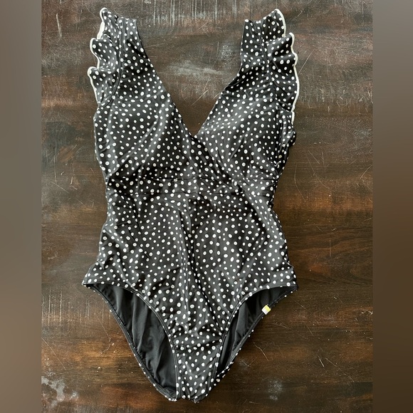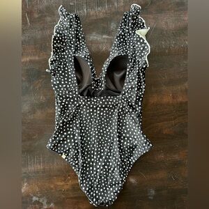 Stylish black swimsuit with white polka dots. Features a deep V-neck and ruffled straps. Gently used by me, it no longer fits. Like new, no flaws.