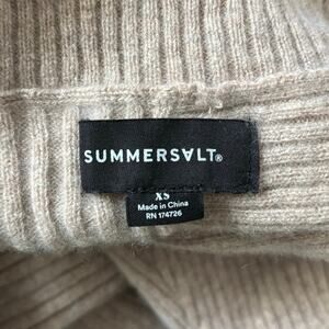 Summersalt turtleneck sweater. Various size and direction ribbing. Extra fine Merino Wool and Cashmere blend. Color is a light brown or oatmeal. There is a black mark on the lower back as shown in the last picture. No holes. Size XS.