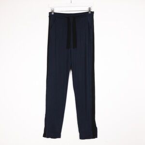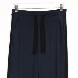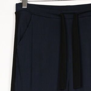 Elastic waistband with drawstring, slits on the side bottoms, pockets, black stripes down the sides