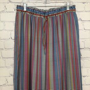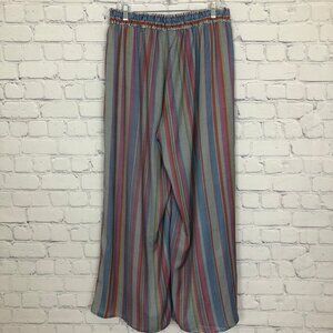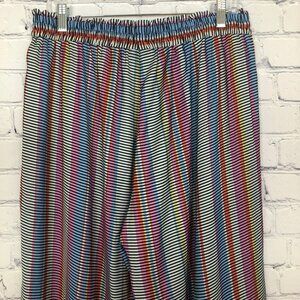 Wide leg palazzo pants in a colorful stripe print. Fabric feels so silky. Elastic smocked pull-on waist with a drawstring. Side pockets.