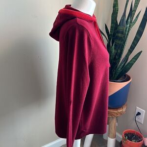 Wine colored hooded sweater trimmed in red in NWOT condition. Cashmere & wool blend.