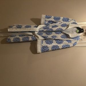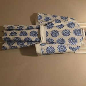 Made of cotton, with blue embroidery 🧵 of daisy's all over.