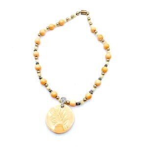 Summery Peach Ceramic Pendant on Beaded Strand, Vintage Bohemian Leaf Imprint Pastel Necklace with Stone Beads and Magnetic Clasp