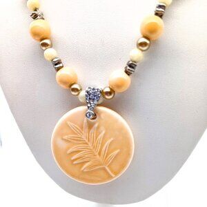 Summery Peach Ceramic Pendant on Beaded Strand, Vintage Bohemian Leaf Imprint