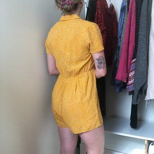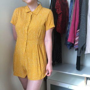 Cute button up romper in a gorgeous mustard yellow with small white polka dots! Size M but fits more like a Small on someone with a larger bust. Super lightweight material perfect for hot days.