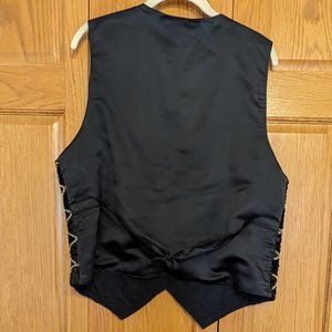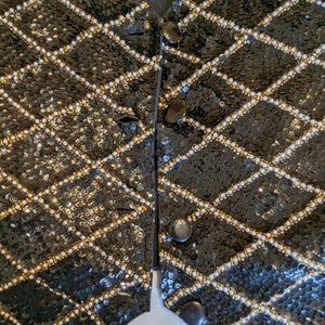 This classy and timeless black vest has sequins, pearls and gold seed beads that sparkle as it catches the light. Versatile piece to mix and match with many pieces in your wardrobe. There is a four button closure and a tie belt in the back.