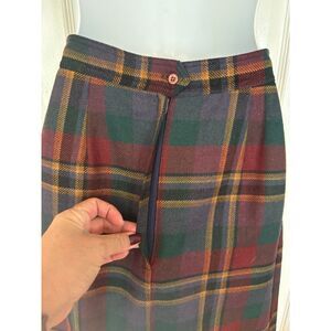 This is a vintage union made plaid skirt from era 1964-1973. It has 2 pleats in front with zipper button closure in back. Lenth is about 27" and waist is about 25". Tag says size 6.