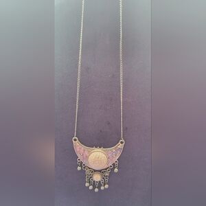 Embossed in dotted and swirling details, a large silver crescent attaches to a smaller frilly frame, creating a stacked pendant. Swinging from the bottom of a lengthened silver chain, the tribal inspired pendant features refreshing white stones, white rhinestones, and silver beaded accents for a seasonal finish. Features an adjustable clasp closure.