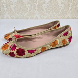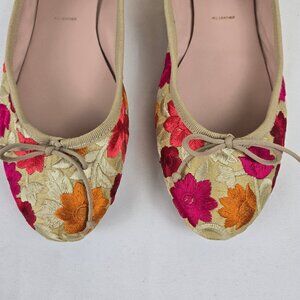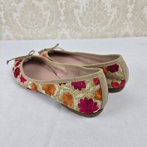 Cream/tan colored ballet flats have an embroidered pattern of flowers and leaves all over. Bow on top. Almond shaped toe. Padded insole. ¼" heel. Made in Italy.