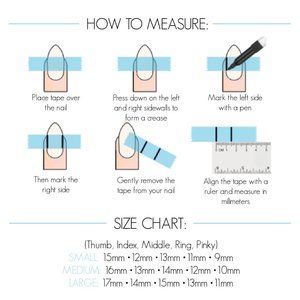 Sizes refer to the width of the nail measured in millimeters (mm) from thumb to pinky and are as follows: