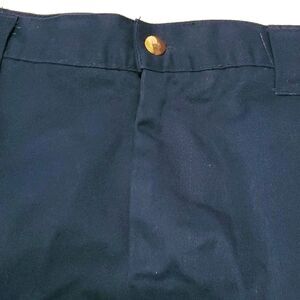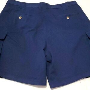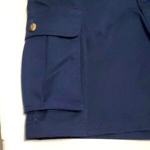 Navy flat front utility cargo shorts. Button and zipper closure. Two slit pockets on the front. Two buttoned cargo pockeys on the side. Two buttoned tailored pockets on the back. Twill material made of 65% polyester and 35% cotton.