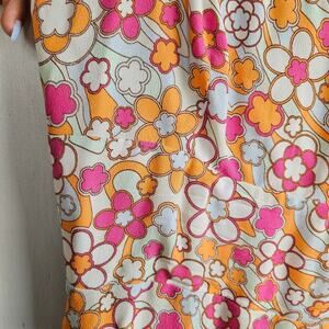 Key features: subtle crepey texture, groovy floral print in pink/light orange/off white/pale aqua, stretch back, skinny straps, lined, back zip