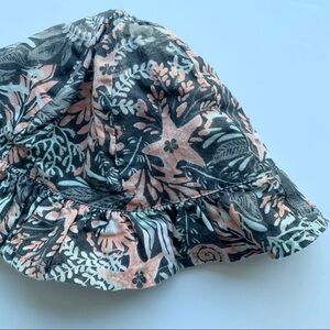 Sun hat made in India with a beach print featuring starfish, coral, seashells and other with a tie in the front