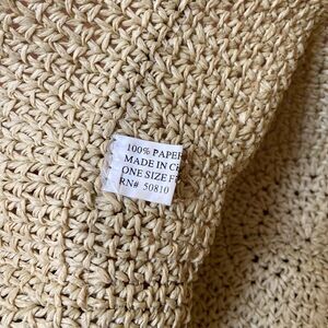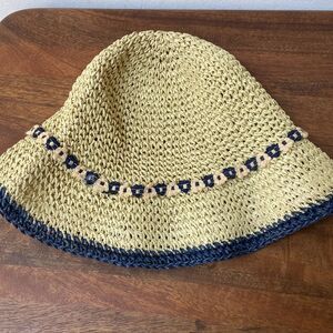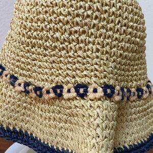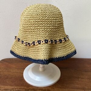 Charming paper made sun hat featuring a stylish navy trim. Perfect for sunny days.