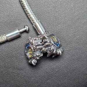 This bracelet tells a cosmic story with its sun and moon charm adorned with sparkling yellow and blue CZ. The silver snake chain adds elegance, making it a timeless piece that whispers celestial beauty. A clasp closure ensures secure wear while complementing the charm's intricate design.