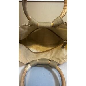 This is a beautiful Sun N Sand small tote bag featuring a unique giraffe and zebra print. The bag is made of a high-quality, durable fabric and has a spacious interior with a zippered pocket for your essentials. The wooden handles are comfortable to carry and add a touch of rustic charm.
