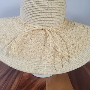 Super cute summer sun hat with a wide floppy brim and decorative trim that is tied at back. Woven straw hat