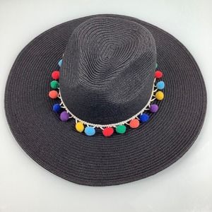 Sun N Sand Wide Rim Pom Pom Multicolor Black Straw Hat Size OSFM 22” EUC