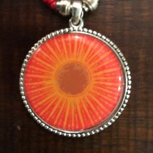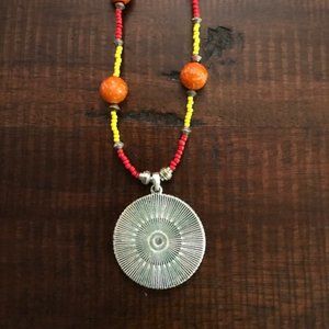 This yellow and red seed bead necklace has a beautiful orange & yellow sun pendant. Larger orange beads with silver tone accent beads and clasp.