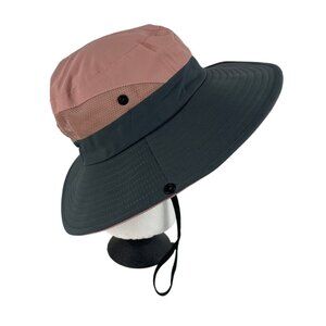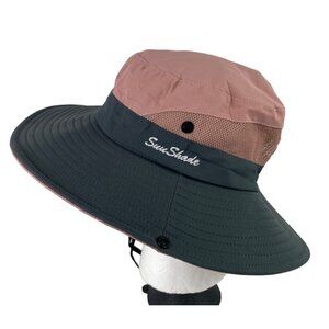 This Sun Shade women's ponytail sun hat in a stylish pink/gray color combo offers UV protection with a foldable wide brim. The adjustable strap ensures a perfect fit, and the durable polyester material guarantees longevity.