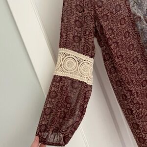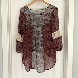 Sun and Shadow semi sheer top. This boho top has a high low hem (longer in the back). Preowned and in excellent condition!