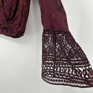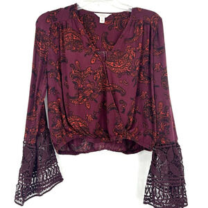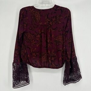 Sun & Shadow Burgundy Drape Front Crop Top Long Crochet Bell Sleeves Size XS