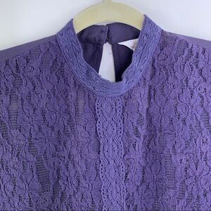 It does not get more romantic than this Sun and Shadow purple lace and chiffon peplum top with bell sleeves and keyhole closure. One button missing. Almost Edwardian with its stand up collar and intense color. Pair with jeans for a casual look or velvet or satin pants for a more formal affair. Please see photos for additional details. Pit to Pit 20“ Length 25“ Sleeve 24“