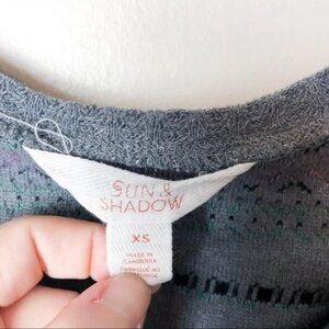 This delightful top from Sun & Shadow offers a blend of comfort and style. Its waffle knit texture adds a cozy touch, while the intricate back detail and subtly striped sleeves lend a unique flair. The gray base with accents of purple elevates its charm. Ideal for layering or standalone wear.