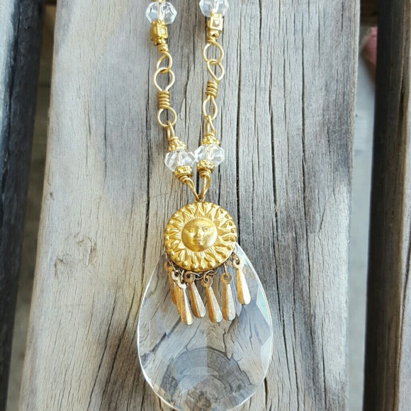 Handmade by me! Sure to bring brightness to anyone's day! I found this cool little sun and paired it with this beautiful clear glass drop. Then I made the chain by wire wrapping gold colored wire with smaller gold colored beads and gorgeous clear faceted glass beads. Gold lobster clasp. 20 & 1/2 inches long and pendant portion measures just over 2 inches tall by 1 & 5/16 wide.