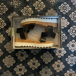 Stylish black wedge sandals with cork footbed. Comfortable and trendy design. 1-1/2” platform. Comfort stretch slip-in sling-back. Worn only a few times.