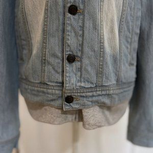 Denim jacket with sewn jersey hoodie sewn trim