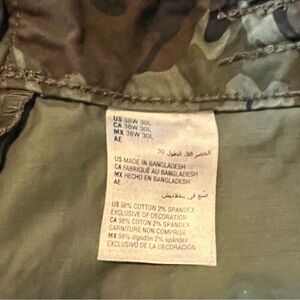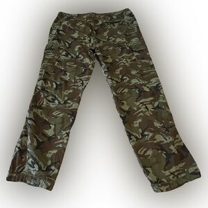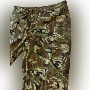 Rugged cargo pants with a classic camouflage pattern. Ideal for outdoor activities. Features multiple pockets for convenience. Size 38w 30L Flat front zip closure cotton blend. Very nice condition.