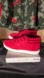 Bold red sneakers with quilted design. Comfortable and stylish for any occasion.
