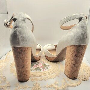 Yet another modern but retro look (think 70s/80s) in this white snake print high heel sandal. This 4" high sandal features a cork 3/4" platform and cushioned insole making these cuties surprisingly comfortable! The cork block heel and high, thick ankle strap make these heels comfy not clunky and walking in these almost effortless! Paired with your favorite jeans, dress or maybe that retro outfit to an 80s concert or party or just to wear out on date night or dinner. Perfect white color for summer. Worn only once with only minor scuffing on soles and lovingly stored in their original box.