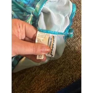 Dive into summer with this vibrant Sun Streak one-piece swimsuit, perfect for beach days or poolside lounging. The suit features a beautiful tropical print in shades of blue and green, capturing the essence of serene ocean waves. Its durable fabric blend of 80% nylon and 20% spandex ensures a comfortable fit with just the right amount of stretch, allowing you to move with ease. The elegant scoop neckline and supportive straps create a flattering silhouette. Ideal for both swimming and sunbathing, this swimsuit is a must-have for your summer wardrobe. Don't miss out on this stylish addition! - Tropical design - Comfortable fit - Durable materials - Size 12 - Great for all swimming activities