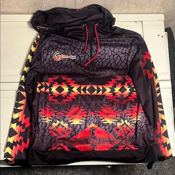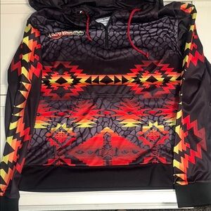 Vibrant Native American Skyn Style lightweight hoodie with geometric patterns. Features red, yellow, and black colors. Perfect for a bold look. Womens size small but I honestly think it runs a little bigger. This comes from a Native American owned clothing brand. Like new!