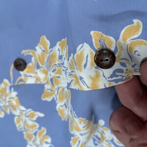 Size large Sun Surf aloha shirt with great purple lavender floral print. Nice pre-owned condition (some wrinkling from wear) with one spot pointed out and made from rayon. See pictures for details and measurements. Orders ship out on Monday, Wednesday, and Friday.