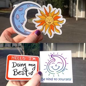 Pack of 4 stickers, Be Kind to Yourself, Hello I'm doing my best, sun, and moon sticker for $16