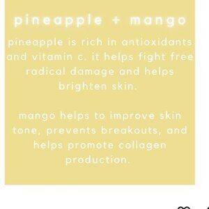 PINEAPPLE is loaded with enzymes which help to break down and sweep dead skin cells away from the surface to reveal radiant skin. MANGO is loaded with powerful antioxidant Vitamin C which helps to prevent premature aging and reverse signs of sun damage.