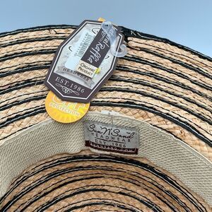 This Scala hat features a wide-brimmed, floppy design in tan and black, perfect for sunny days. Crafted from woven straw, it offers a stylish and practical accessory for beach outings. The subtle decorative accent adds a touch of elegance to its classic look.