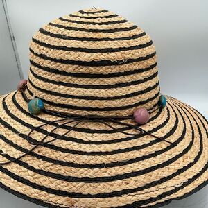 This Scala hat features a wide-brimmed, floppy design in tan and black, perfect for sunny days. Crafted from woven straw, it offers a stylish and practical accessory for beach outings. The subtle decorative accent adds a touch of elegance to its classic look.